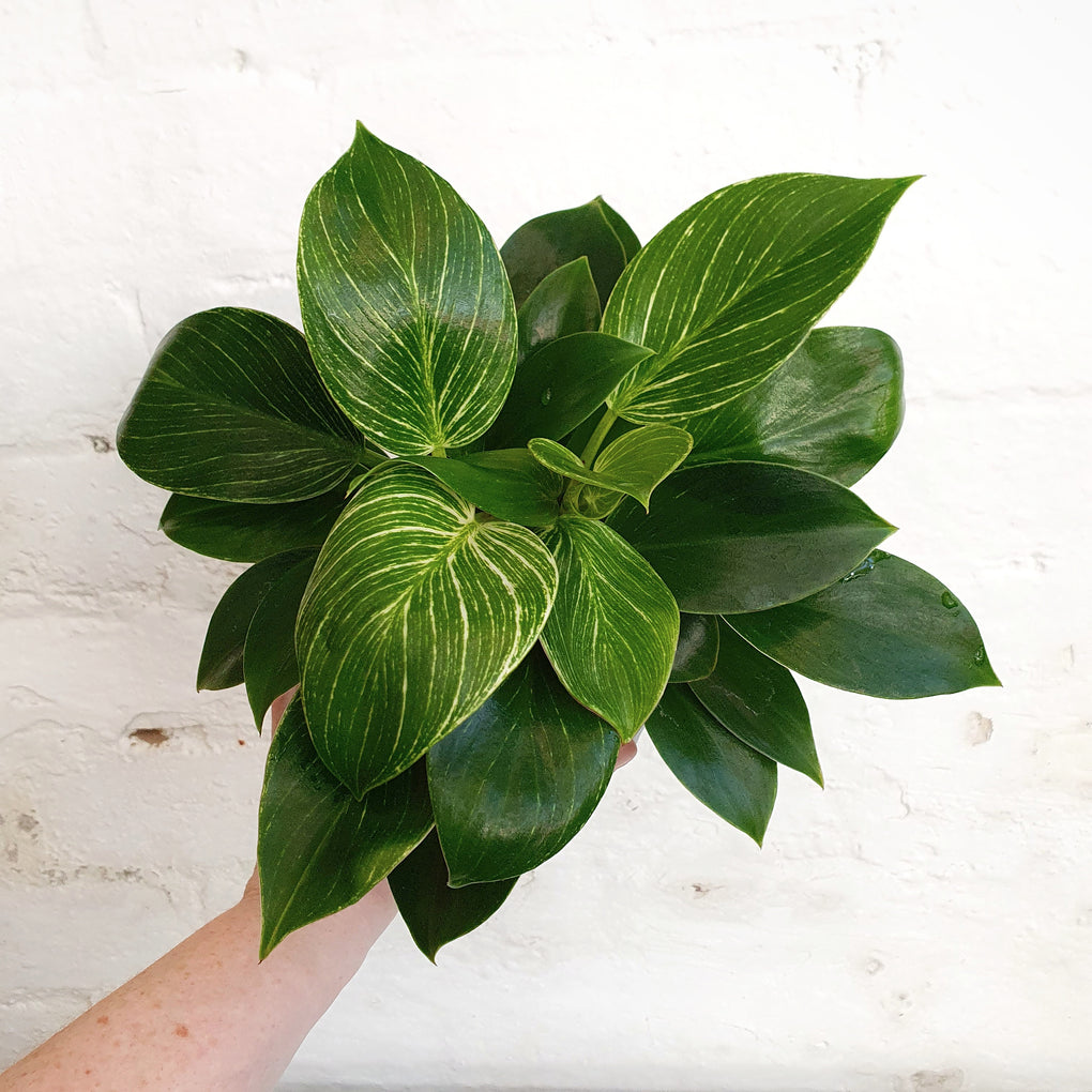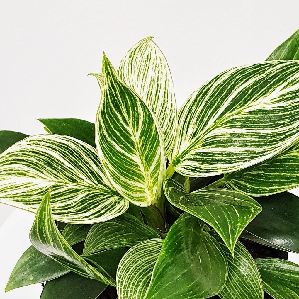 A clumping, ornamental philodendron that grows to around 30cm. Green glossy leaves sport thin white striped variegation, increasing with age, that will require plenty of bright, indirect light (not direct sun) to look its best.