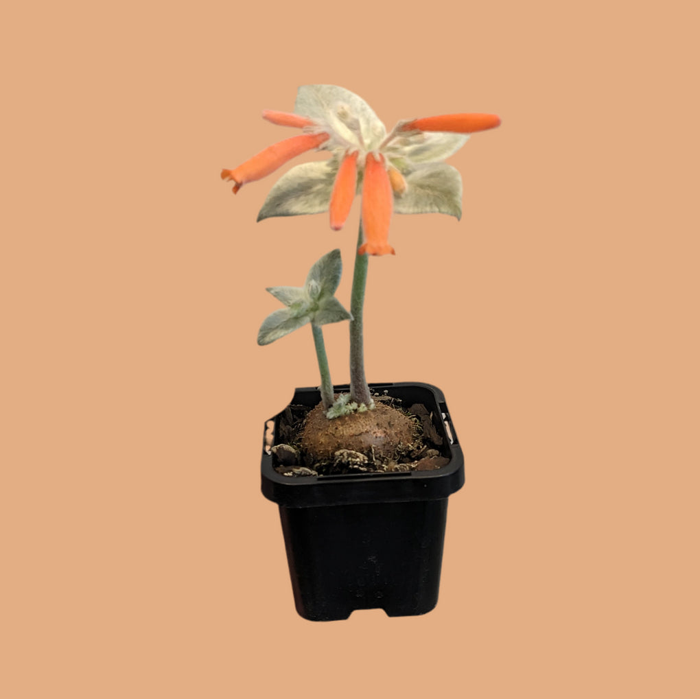 Soft densely felted foliage, emerging from a large, above ground tuber that will continue to expand up to 20cm across over 20 to 30 years. Produces beautiful bright orange flowers. Enjoys bright light.