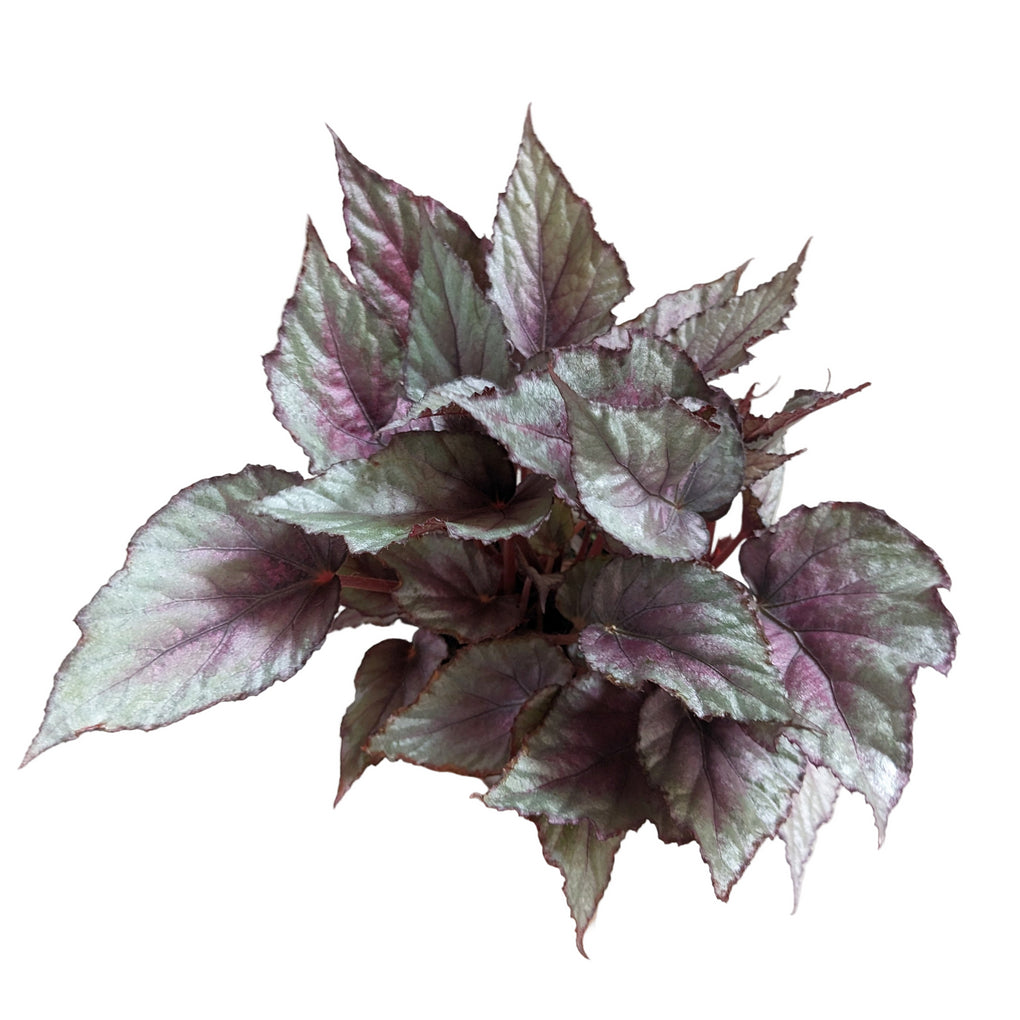 Rex begonia with stunning metallic foliage, purple, green and silver with a vibrant pink flush in the middle. Beautiful shimmering pink flowers. Rex begonias like a well-lit position, free draining soil, and being allowed to dry between waterings.