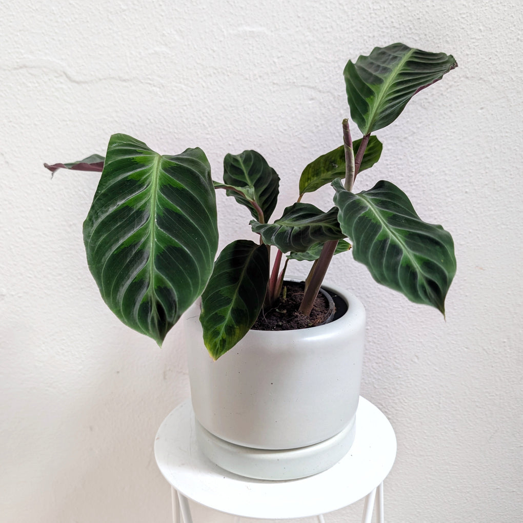 Featuring deep green, velvety leaves with lighter feathered venation and rich purple undersides, these striking indoor plants thrive in bright indirect light and love humidity. Don't allow to dry out too much between waterings.