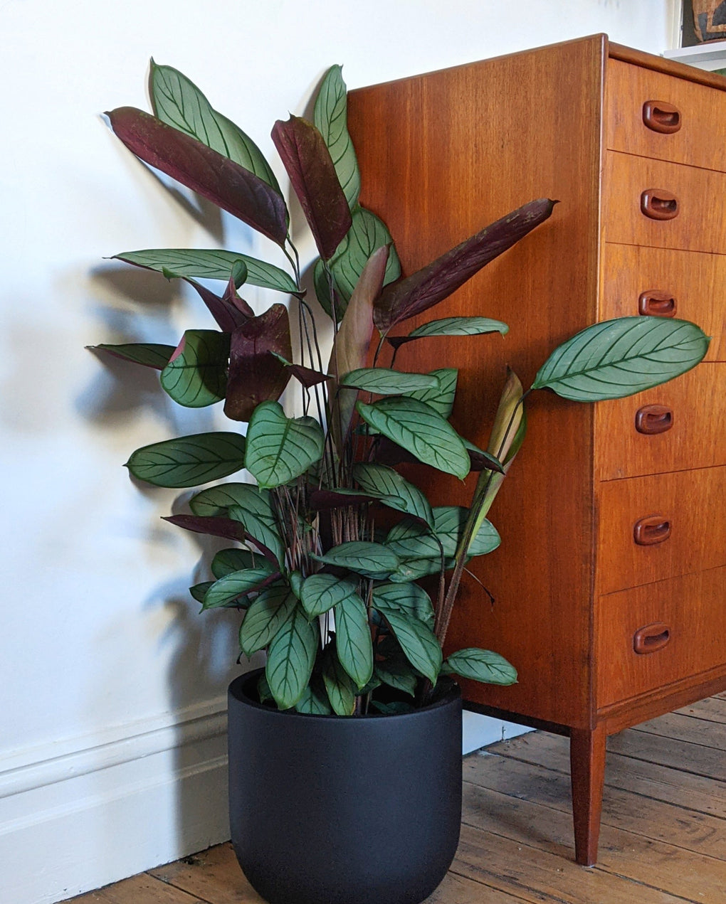 This easy care indoor plant know as C. 'Silver Star or C. 'Grey Star' has striped green leaves backed with purple, that dance in response to changing light throughout the day. Raising their leaves at night, the Ctenanthe has a nickname of 'Prayer Plant’.