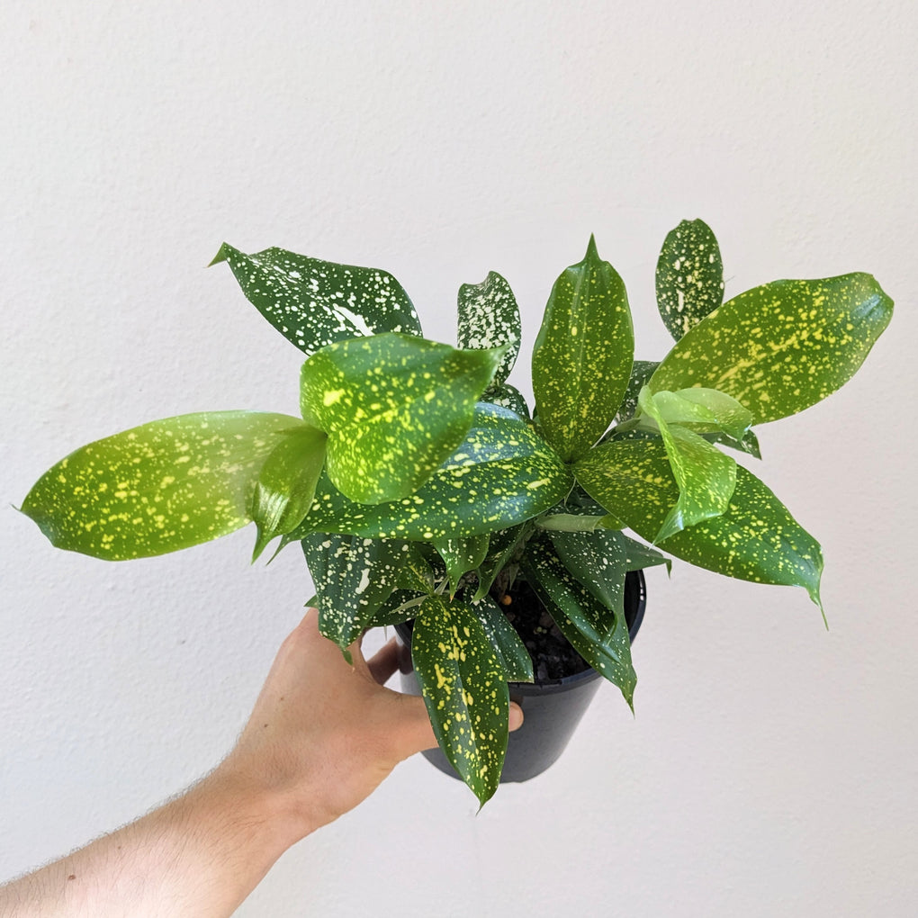 A slow growing and hardy Dracaena with bamboo-like stems. The Florida Beauty has glossy leaves with creamy yellow speckles which age to white. This hard to find, but easy to care for plant prefers bright indirect light inside or a shaded position outdoors. Provide a good quality, well draining potting mix to keep it happy.