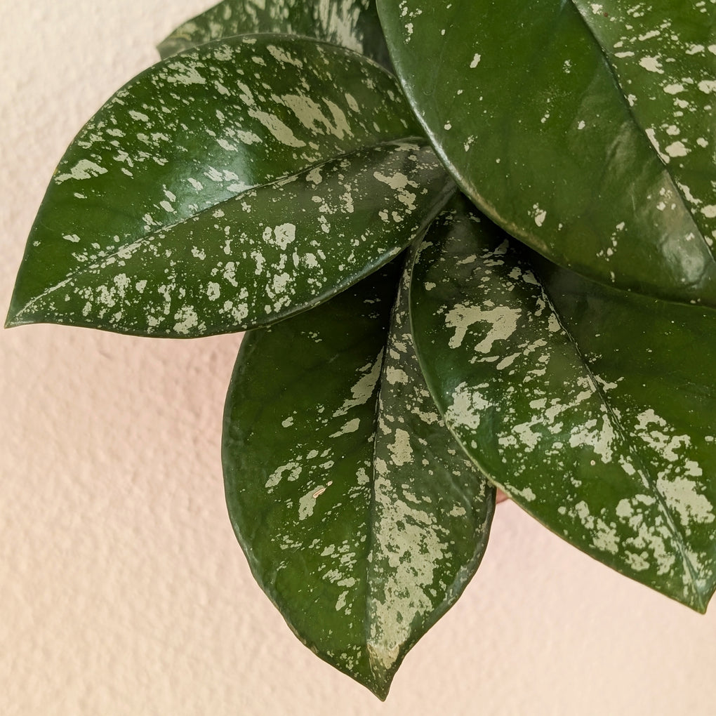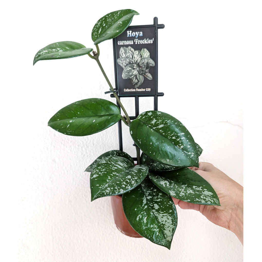 Hoya carnosa 'Freckles' is a charming vining plant with thick, waxy leaves speckled with silvery or creamy flecks, giving it a distinctive “freckled” appearance. A variation of the classic Hoya carnosa, this cultivar is both hardy and attractive, and over time, it may produce clusters of fragrant, star-shaped pink flowers. Its trailing growth habit and unique foliage make it a standout choice for hanging baskets or shelves.
