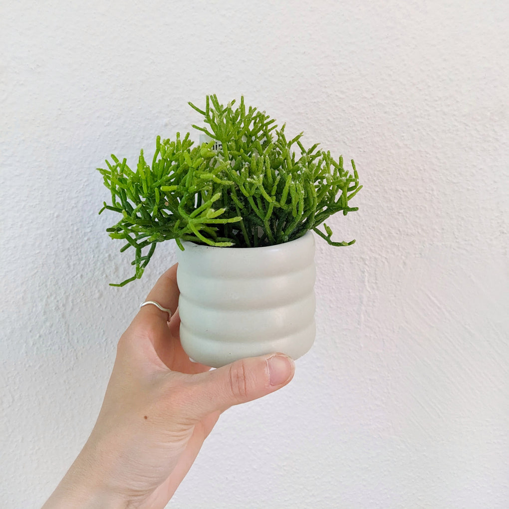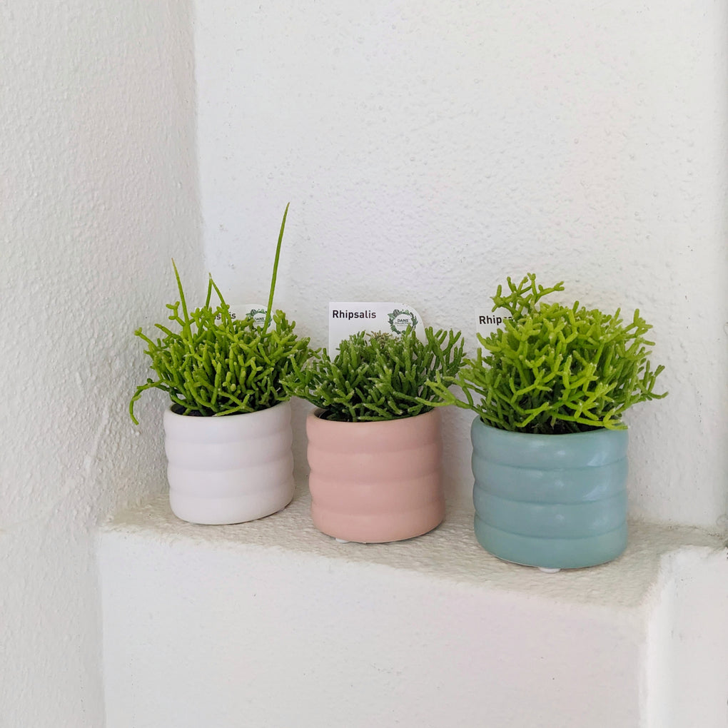 This sweet pairing is a super easy care gift for any loved one. Each plant sits inside a 6cm black plastic nursery pot and then placed seamlessly into the ceramic pot (2 seperate pieces). Mini ceramic planters feature a rippled shape in four soft colour ways.