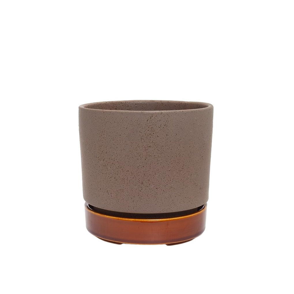 The Pollock Planter features a circular, matte finish stoneware body with a glossy burnt orange drip tray. The unique contrast of texture and colour makes this planter a perfect statement piece for showcasing a favourite indoor plant.