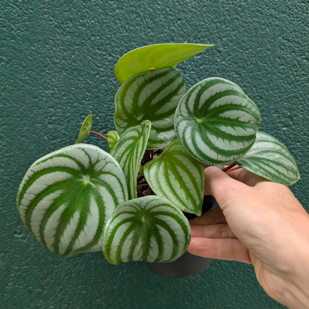 With its round shimmery green and silver leaves that resemble the skin of a watermelon on bright red stems, this highly sought after Peperomia makes a sweet addition to any houseplant collection. A slow-ish grower that likes a well-lit position indoors and to dry between watering.