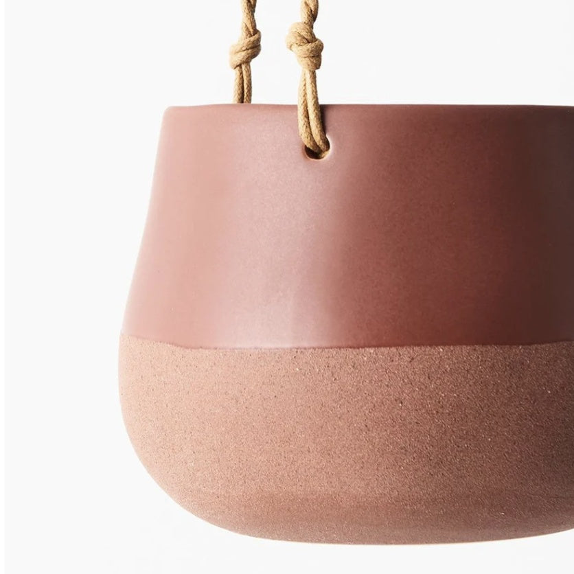 Add warmth and elegance to your space with the Solace Hanging Planter, a handmade ceramic piece crafted with care and designed to elevate any indoor nook. Featuring a rich chestnut colour palette, this planter pairs a glossy glazed finish on the top half with a natural, textured ceramic base adding a beautiful contrast of tone and character.