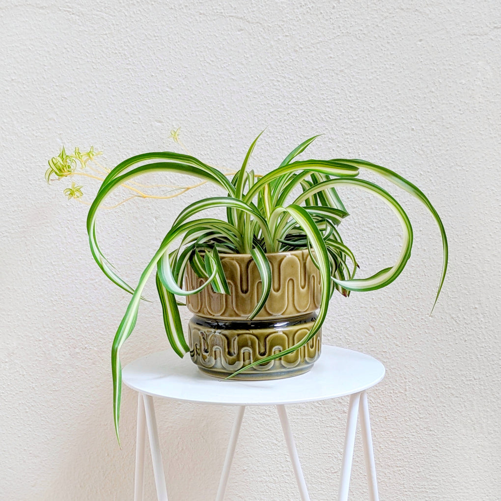The Bonnie is a compact variety of the hardy, classic spider plant. Easy care and low maintenance making it the perfect indoor plant. Give it a spot with bright filtered light and keep its soil moist and it will be happy.