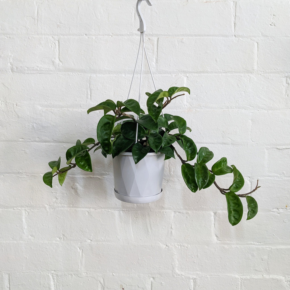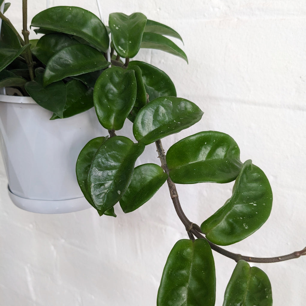 Hoya Krinkle is a bold and distinctive variety known for its large, crinkled leaves. A variation of the classic Hoya carnosa, this cultivar boasts thick, glossy foliage with deep dimples or folds, giving it a textured, sculptural appearance. The plant produces clusters of fragrant, star-shaped flowers—typically pink with red centres—under the right conditions. Its vining growth makes it suitable for hanging baskets or trellised displays.