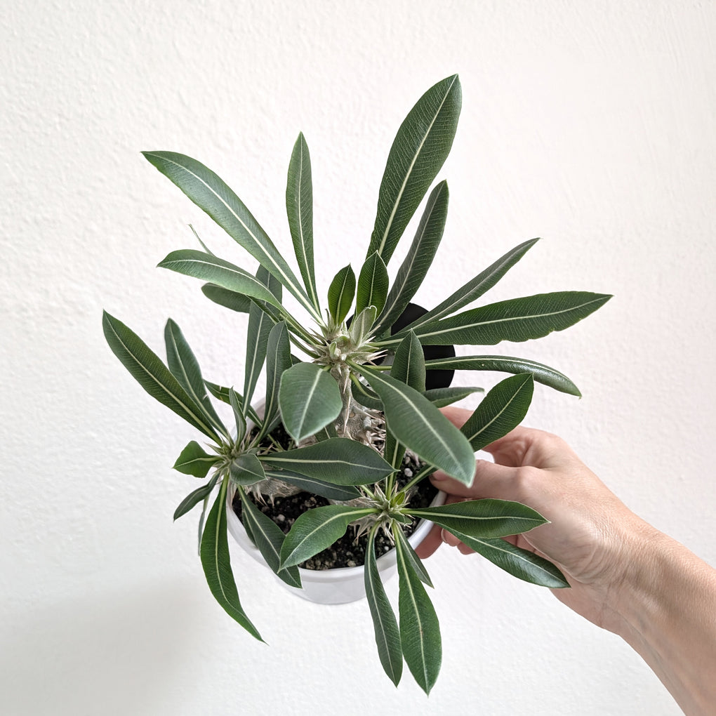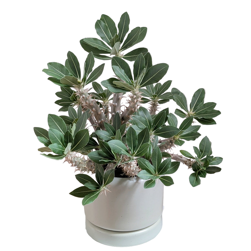 The Madagascar Palm is famous for its stunning silhouette of sharp thorns. Pachypodium rosulatum is a compact species, forming a thick base as it matures. A real statement plant for any collector. Provide plenty of bright light indoors and water minimally to keep this fascinating plant happy and healthy.